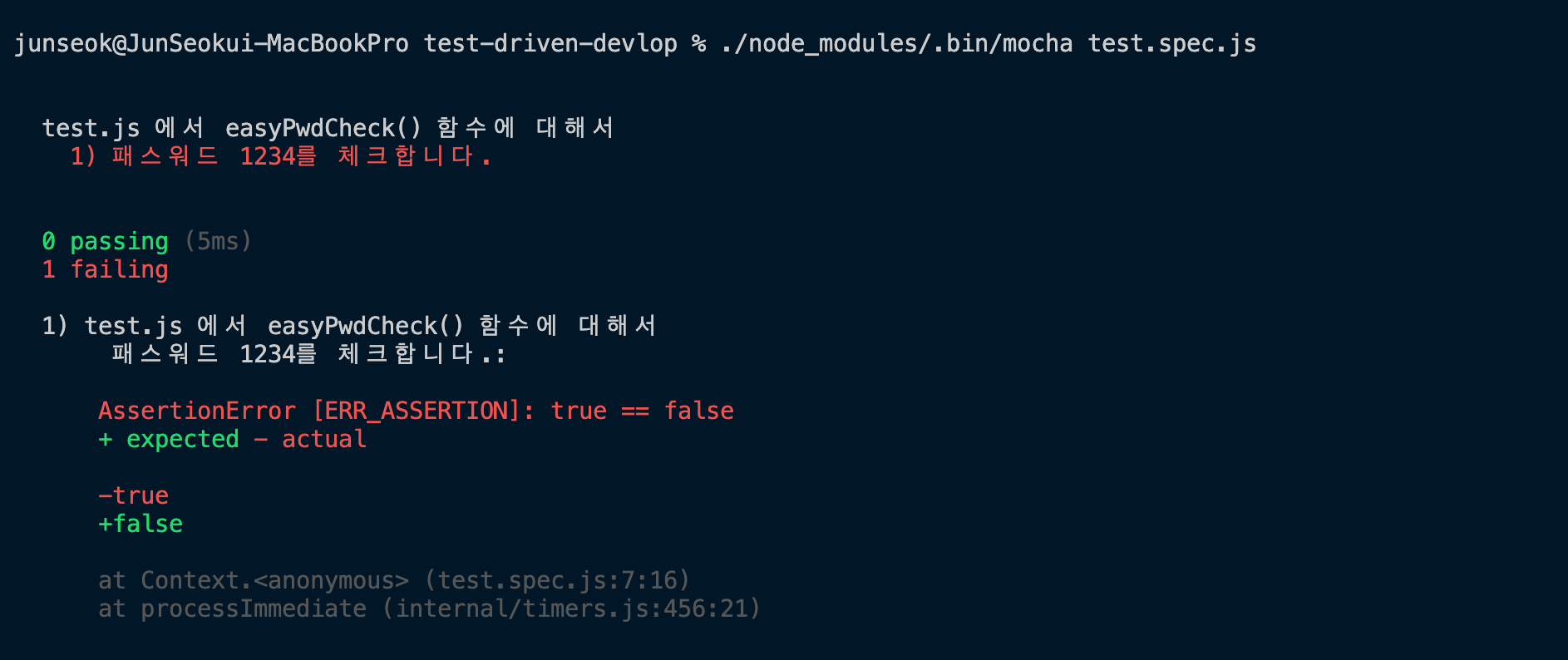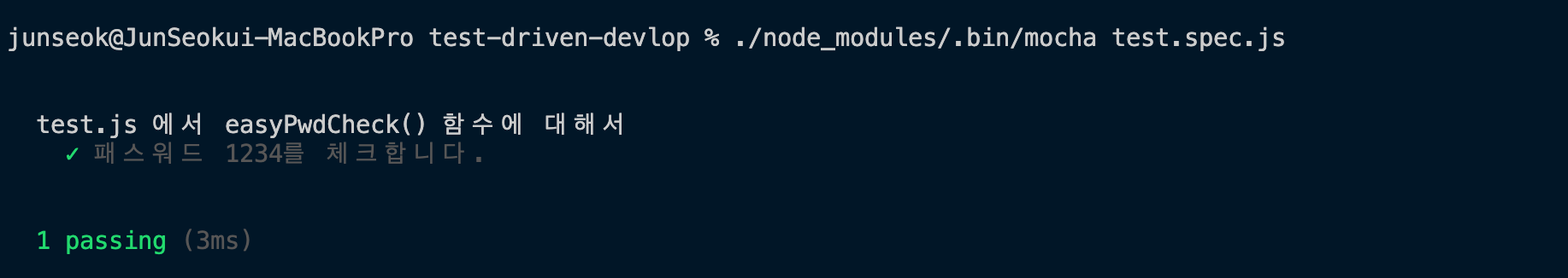 true 로 변경을 한뒤에는 easyPwdCheck() 함수가 작성한 테스트 케이스를 통과 되는것을 확인해볼수 있습니다.