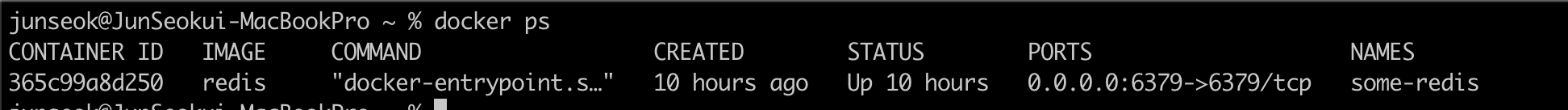 해당 명령어를 가져온후 some-redis 이미지를 실행하면 아래와 같이 redis 컨테이너 이미지가 보입니다.